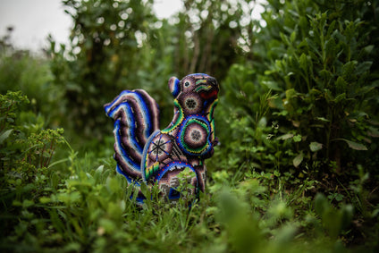 Figura de jaguar forrada de hilo o estambre, formando simbolismos típicos de la etnia de los huicholes..