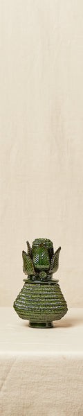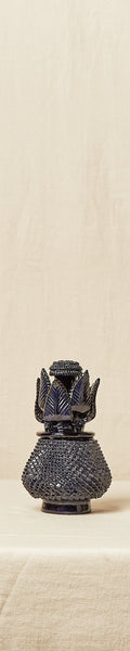 Piña con Roseta de tamaño pequeño, elaborada de manera artesanal en Barro vidriado y Barro en Pastillaje de color azul cobalto, es una pieza auténtica y especial para enriquecer cualquier espacio especial. Originarias de la meseta purépecha, en Michoacán, se dice que las Piñas Mexicanas y las Biznagas tuvieron su origen allá por la década de 1960. Los artesanos de esta localidad son afamados por crear estas impresionantes piñas, dándole una indudable seña de identidad al estado de Michoacán. Destinadas a la decoración y al uso como soperas o poncheras,cada piña lleva un proceso muy laborioso de trabajo manual por medio del uso de la técnica del pastillaje y el pellizcado, consistente en la aplicación de muchos, y pequeños, trozos de arcilla modelados con formas orgánicas que revisten el cuerpo de la piña, dándole una textura que evoca su superficie. Disponible en más colores.