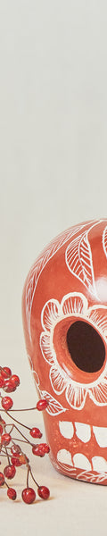 Calavera elaborada de manera artesanal en barro pintado y bruñido, en un elegante tono rojo, decorada con delicados motivos florales en blanco. Su acabado bruñido le da un brillo especial que resalta los detalles pintados a mano, reflejando la tradición y el estilo del arte popular mexicano.