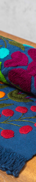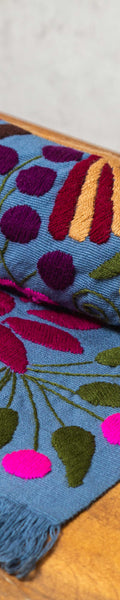 Hand-embroidered table runner using the Zinacantán technique on a blue cotton base with multicoloured details. A true gem that, due to its versatility, can also be used as a tapestry, adding a unique accent to any space in your home.