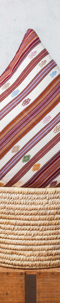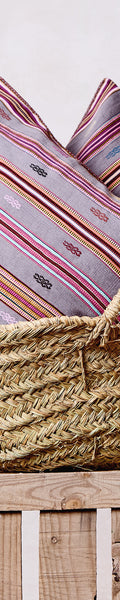 Cojín tejido a mano en Telar de Pedal con diseño de rayas brocadas entretejidas de minuciosos detalles a color. Una joya difícil de encontrar por su laboriosa elaboración. Ideal para quienes buscan calidad y distinción en la decoración de su hogar. Pie de cama a juego disponible. Posibilidad de comprar el relleno a parte.