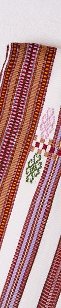 Hand-woven bed footboard on a pedal loom with brocade stripes interwoven with minute coloured details. A jewel that is difficult to find due to its laborious workmanship.