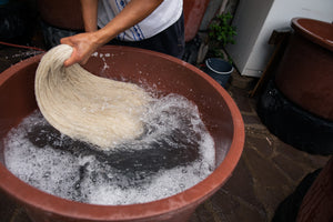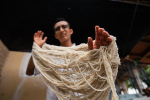 Puisqu'ils reçoivent la laine vierge fraîchement tondue des moutons, qu'ils cardent et filent, avec un vieux rouet en bois, créant des écheveaux qu'ils lavent, puis les teignent avec des colorants naturels, qu'ils collectent eux-mêmes dans la nature.