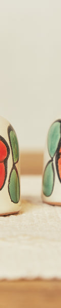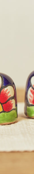 Pack de salero y pimentero elaborado de manera artesanal en barro esmaltado, con un acabado azul brillante y delicadas flores rojas pintadas a mano.