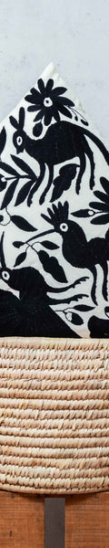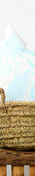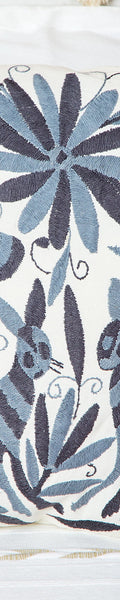 Cojín blanco de algodón, con bordado Tenango en tonos azules. El dibujo del bordado puede sufrir pequeñas variaciones al ser un producto hecho a mano y de manera individual. Se vende por unidades.
