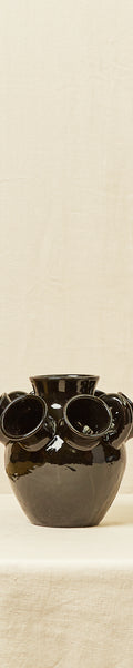 Jarrón de varias bocas, elaborado de manera artesanal con la técnica del barro esmaltado, en color negro. Disponible en más colores.
